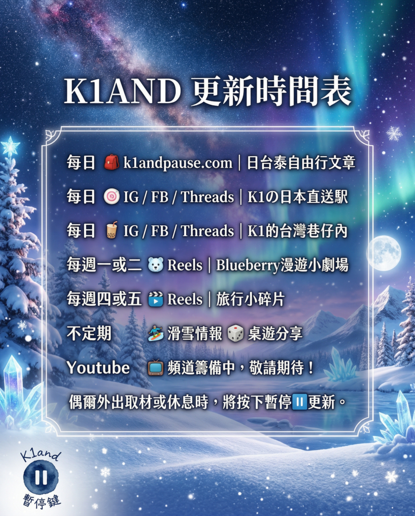 關於K1AND 理念:按下暫停鍵,找回生活的節奏 在這個快節奏的世界裡,K1AND 是一個允許你「慢半拍」的專屬空間。 這裡收藏了世界各地的旅行風景、趣味的桌遊體驗,以及生活中的美好碎片。我們相信,旅行的意義不僅是打卡,更是學會為繁忙的日常按下暫停鍵(Pause)。給自己一點空間、一點時間,在旅途中真正地放慢腳步,感受當下。 園主 KIN Press pause and discover the life. 收藏旅行風景 ✈️ 遊戲 🎲 生活小碎片 ✨ Jan, 2026 K1AND開幕 Blueberry 請我喝珍奶! Marshmashow 請我喝珍奶! 聯絡我們 Please enable JavaScript in your browser to complete this form.Please enable JavaScript in your browser to complete this form.名稱 *FirstLast 電郵 信息 名稱 電郵 *信息提交