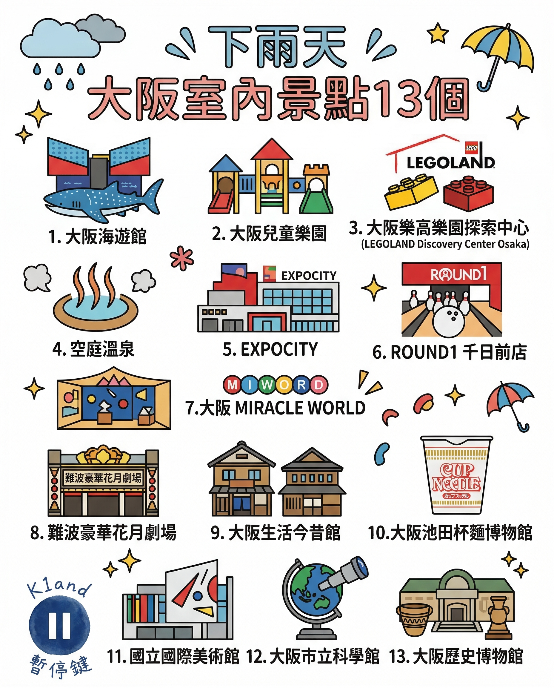 規劃大阪自由行,最令人擔憂的莫過於突如其來的雨天或極端天氣打亂了精心安排的行程。其實大阪擁有非常多具備極高娛樂性與文化深度的室內景點,完全不受日曬雨淋影響。本文為您梳理13個無懼風雨的大阪室內景點,從世界級水族館、沉浸式博物館、大型溫泉主題樂園,到親子同樂的科學館與積木樂園,應有盡有。讓您的雨天行程同樣精彩豐富,出發前趕快將這篇收入口袋名單!