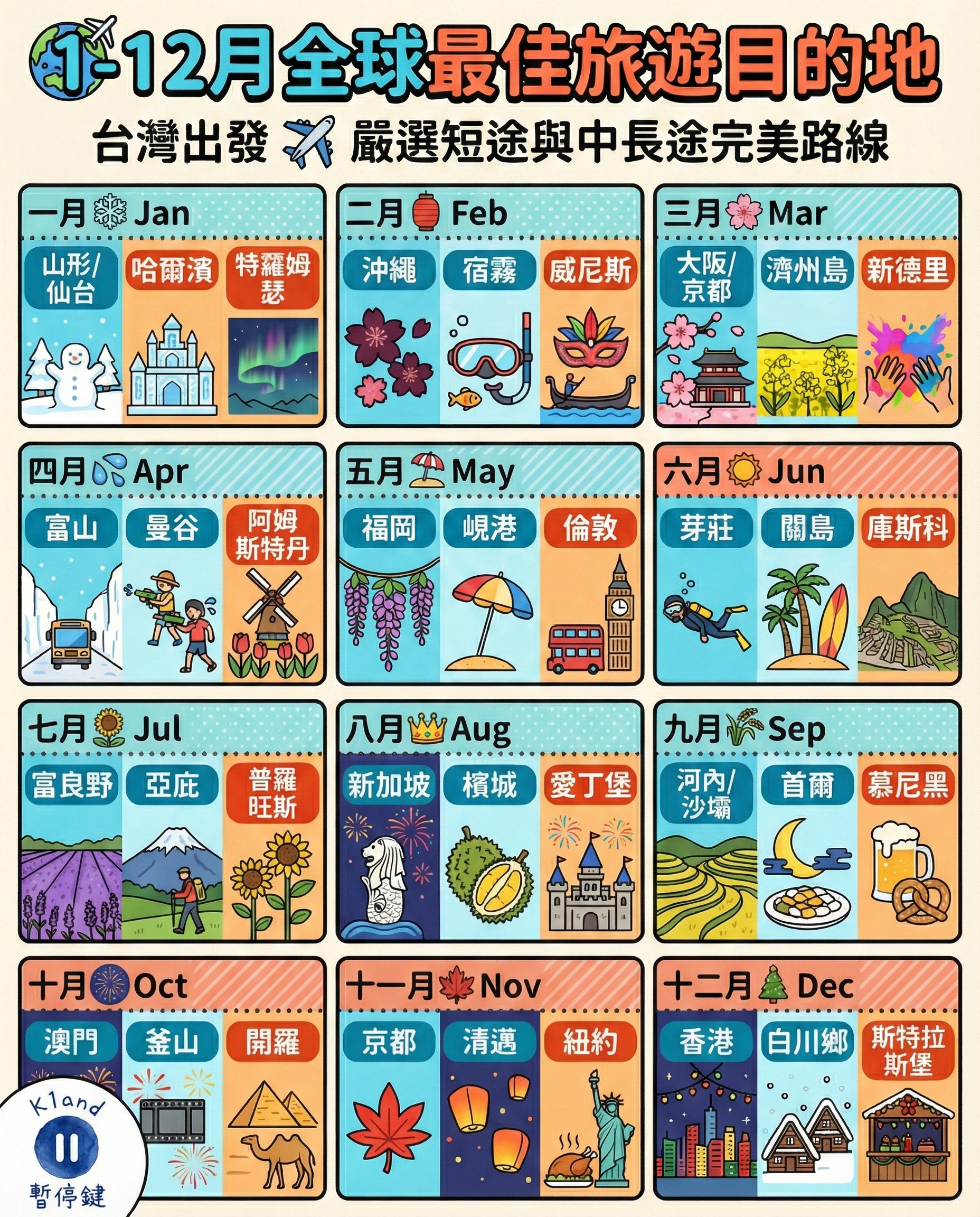 準備好規劃今年的完美假期了嗎?想把珍貴的特休假發揮到極致,在「對的時間」看到最美的風景,這份專為台灣出發的旅客打造的【1-12月全球最佳旅遊目的地】終極指南您絕對不能錯過!無論是想在冬季飛往日本賞粉雪、春季到日韓追櫻花、夏季前往海島避暑度假,還是秋季漫步於歐洲的楓紅街道。現在就跟著這份旅遊月曆,輕鬆展開高性價比的夢幻自由行!
